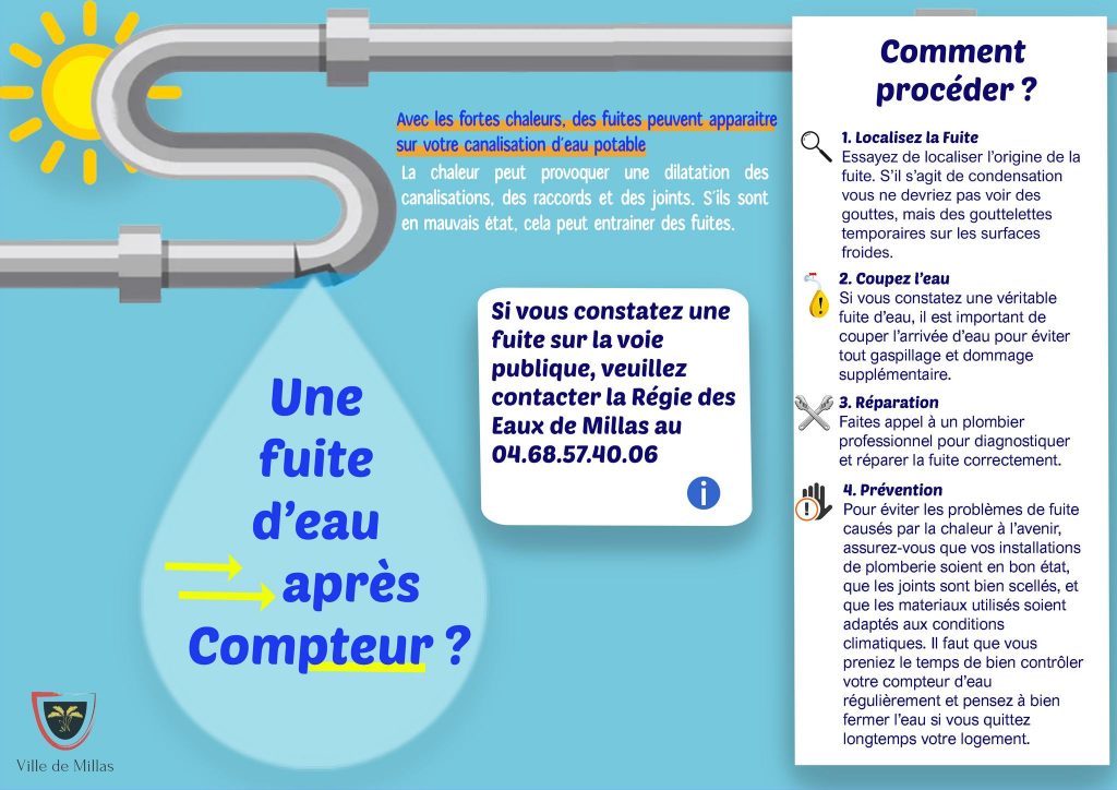 Si vous avez un doute ou si vous avez une suspicion de fuite sur le domaine public, merci de bien vouloir informer la Régie des Eaux au 04.68.57.40.06