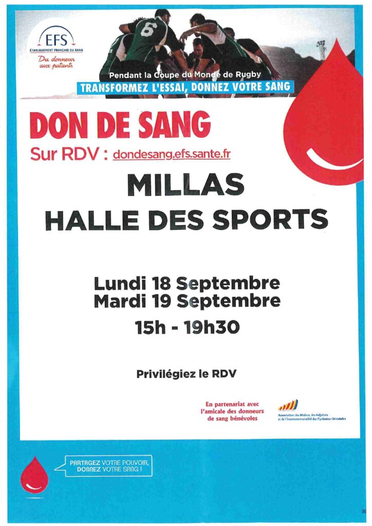 Une collecte de sang est organisée par l’établissement du Sang à Millas.