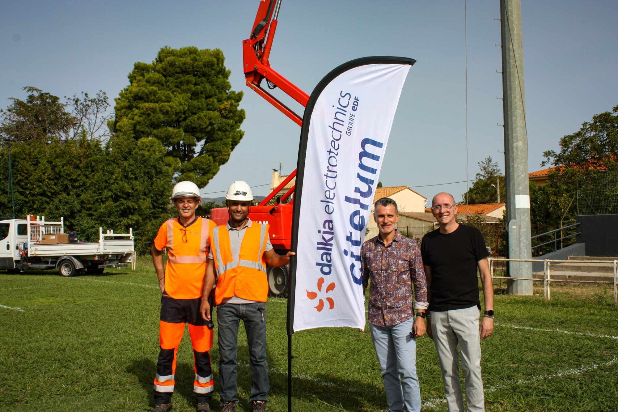 es ouvriers sont à pied d’œuvre autour des mâts, prêts à recevoir les nouveaux projecteurs à Led. Un système d’éclairage plus performant et économe. Cela permettra de baisser la consommation jusqu’à 3 fois la consommation d’énergie.