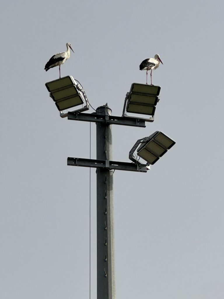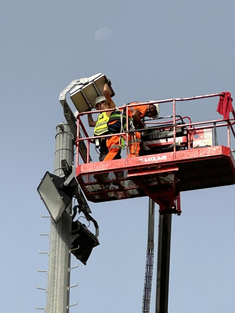 Lancés il y a quelques jours, les travaux de rénovation de l’éclairage du Stade Municipal vont bon train et se termineront pour la fin de semaine. Les travaux avancent à grand pas avec une partie des projecteurs mis en place sous la surveillance d’invités exceptionnels semblant apprécier ce changement.
