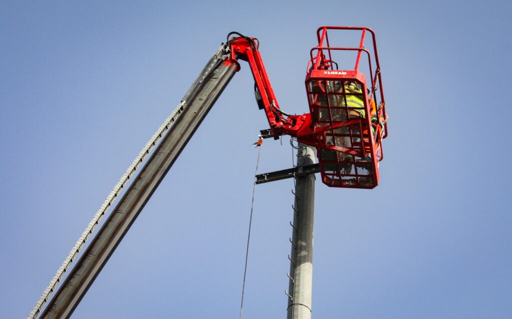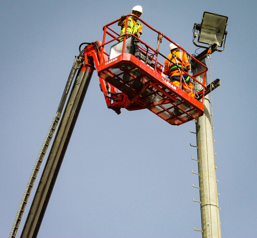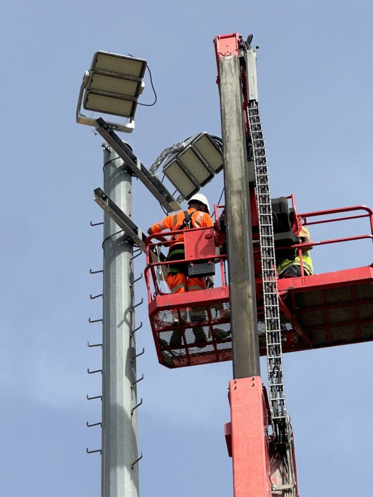 es ouvriers sont à pied d’œuvre autour des mâts, prêts à recevoir les nouveaux projecteurs à Led. Un système d’éclairage plus performant et économe. Cela permettra de baisser la consommation jusqu’à 3 fois la consommation d’énergie.